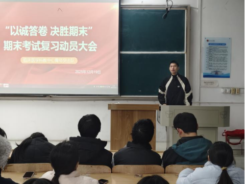 王梦如阐明了大会的主题与目的。范若普在动员讲话中指出,端正学习态度、严守考试纪律是每位学生的基本要求,并号召大家以严谨学风和踏实作风投入复习。他结合自身经验,从时间管理、重点梳理、心态调整等方面分享复习策略:一是制定详细计划,合理安排每日学习任务;二是依据课程大纲与教师提示,系统整理归纳知识;三是保持规律作息与平稳心态,及时向师生请教,确保复习过程高效有序,力争在期末考试中取得理想成绩。