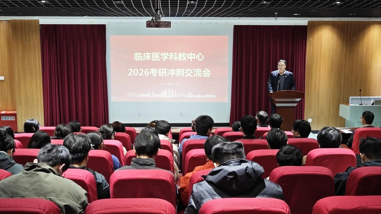 为深入推进考研指导服务工作,全力助力2026届临床医学专业考研学子高效冲刺,11月7日,医学部于一楼报告厅召开临床医学科教中心2026考研冲刺交流会。校党委医学工作部部长李喜强、基础医学院院长王黎、临床医学科教中心主任王辉、副主任张楠、辅导员马社敏、胡玉龙及考研学生代表参会,王辉主持会议。