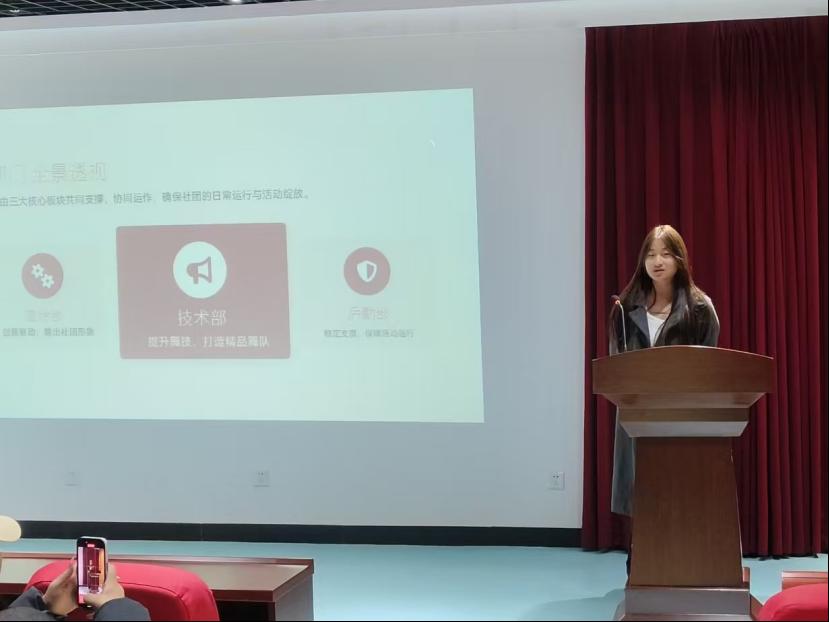 首先,郑珂馨对新成员的加入表示热烈欢迎,阐述了街舞社在丰富校园文化、促进跨年级交流中的重要意义。她鼓励社团以舞蹈为媒介,搭建沟通桥梁,激发更多青春活力,为校园文化注入多样色彩。随后,社团技术部、宣传部、后勤部三个部门的负责人依次上台,详细介绍了各部门的主要职责与工作规划。最后,社团成员们踊跃上台自我介绍,纷纷表示将积极参与社团训练与活动,为社团发展贡献自己的力量。